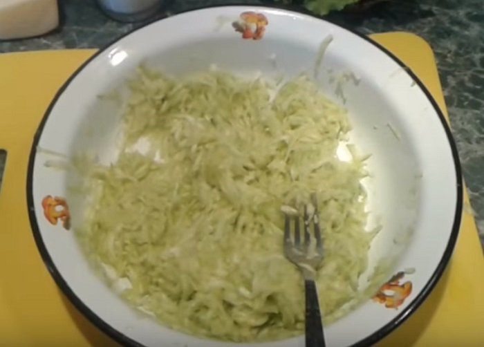 Cukinię umyj a następnie obierz i zetrzyj na tarce o grubych oczkach. Startą cukinię odstaw na kilka minut, żeby puściła wodę, a następnie dokładnie odciśnij.
