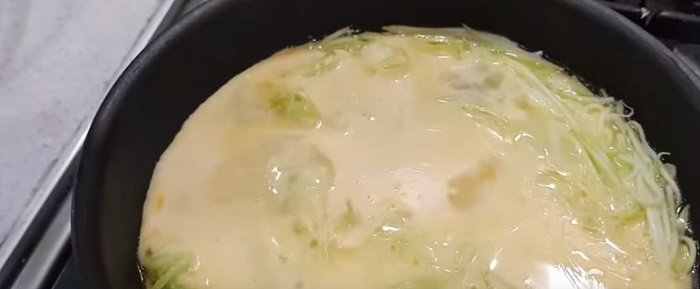Do smażącej się cebuli dodaj połowę startej cukinii. Całość wymieszaj i smaż około 3-4 minut. W między czasie wbij do pozostałej cukinii dwa jajka i dokładnie wymieszaj.