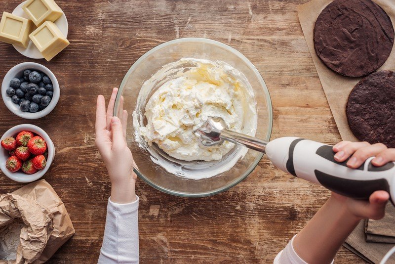 Połącz wszystkie składniki na nadzienie (oprócz truskawek) i ubij do uzyskania gładkości.