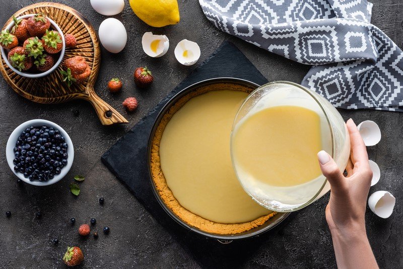 Wyjmij ciasto z lodówki, rozwałkuj je i ułóż na dnie i bokach formy. Na wierzch ciasta wylej nadzienie śmietankowe, a następnie połóż truskawki.