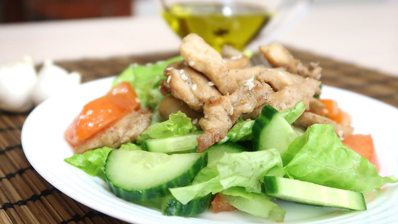Przygotuj marynatę z sosu sojowego i czosnku. Fileta pokrój w kostkę, a następnie włóż go do marynaty na 20 minut. Po zamarynowaniu smaż mięso do czasu, aż zyska złoty kolor.