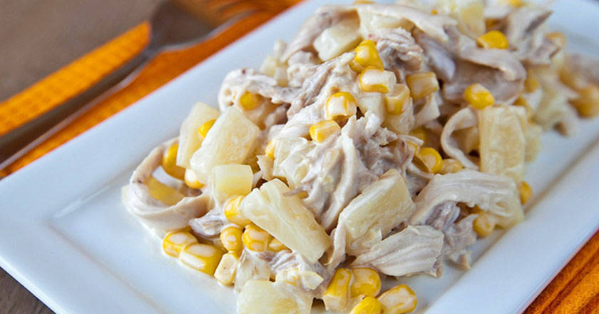 Połączenie ananasa i soczystego kurczaka to bardzo interesująca kombinacja. Kukurydza, pieczarki, ser, cebula, czosnek i majonez, w połączeniu z ananasem oraz kurczakiem to świetna sałatka, która będzie hitem każdej imprezy.