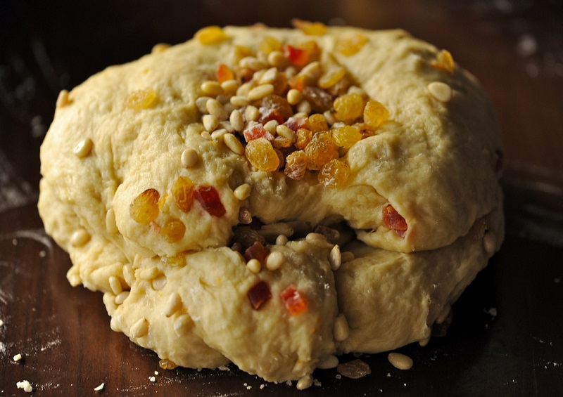 Zagnieć starannie ciasto (ok. 10 minut), aby wszystko dokładnie się połączyło. ( Konsystencja ciasta powinna przypominać gumę do żucia – być elastyczne i rozciągliwe). Do gotowego ciasta dodaj orzechy, rodzynki, kandyzowane owoce, a następnie wszystko wymieszaj.