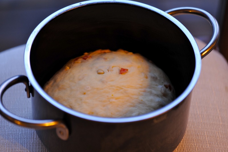 Pozostaw ciasto na ok 1.5 godziny w ciepłym miejscu, aby jego obojętność zwiększyła się co najmniej dwa razy. Wybrane naczynie do pieczenia zapełnij ciastem (dokładnie 1/3 jego obojętności), ale najpierw przykryj je pergaminem. Ciasto powinno wypełnić naczynie po brzegi, aby tak się stało pozostaw je na ok.1 godzinę w ciepłym miejscu.