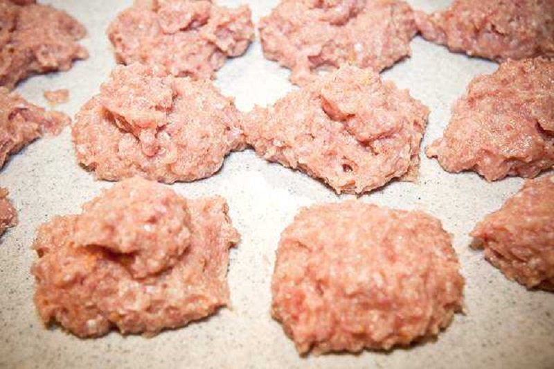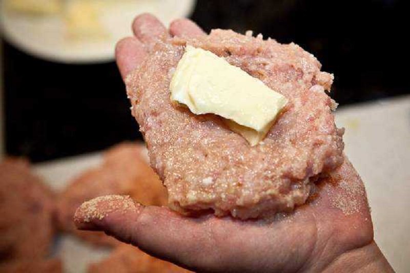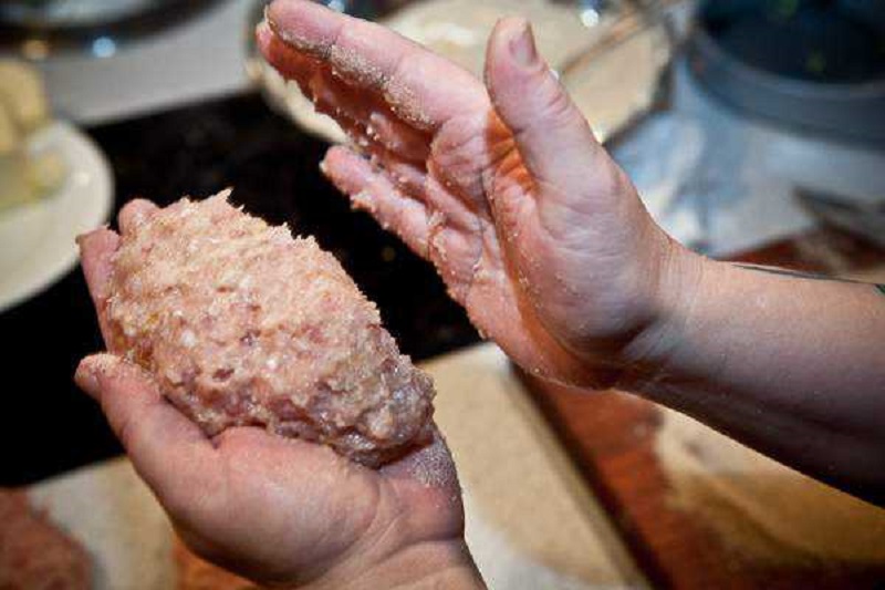 Kiedy masa będzie gładka, podziel ją na osiem równych części. Masło także powinno przejść tę samą drogę – podziel je na 8 równych, podłużnych kawałków. Formuj z mięsa placuszek, na którym umieścisz kawałek masła.