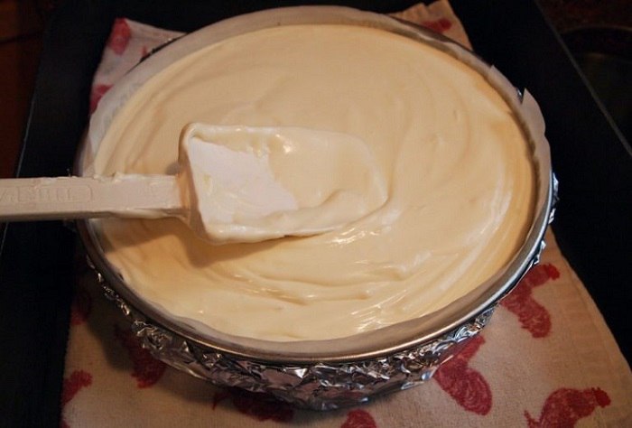 Okrągłą formę wyłóż papierem do pieczenia. Piekarnik rozgrzej do 180 stopni. Ciasto na sernik wlej do formy i delikatnie wygładź szpatułką. Piecz około 30 minut, aż wierzch sernika ładnie się zrumieni.