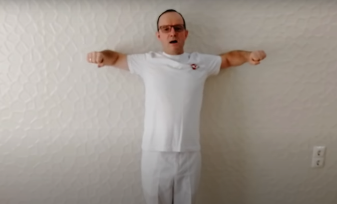 Stań przy ścianie, zachowując od niej mały odstęp. Oprzyj się o nią łopatkami i ramionami. Wyciągnij ręce do przodu, tak, aby utworzyły kąt prosty z tułowiem. Weź głęboki wdech, a podczas wydechu skieruj łokcie do ściany, starając się je maksymalnie docisnąć. Powtórz to ćwiczenie 10-15 razy.