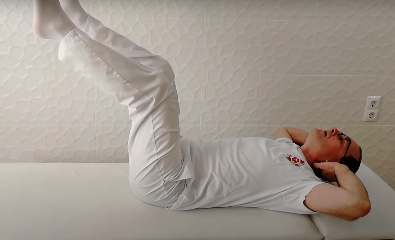 Pozostań w leżeniu na plecach. Podnieś nogi do góry i zegnij je w kolanach. Aby pozycja była bardziej komfortowa możesz oprzeć je np. o stołek. Oprzyj tył głowy na rękach zgiętych w łokciach. Oddychaj głęboko, a kiedy robisz wydech, unoś podbródek ku górze. Szyja ma pozostać przy tym wyprostowana.