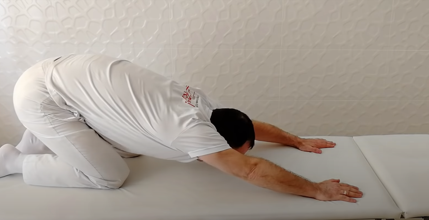 Teraz połóż się na brzuchu. Zegnij ręce w łokciach, dłonie ułóż na wysokości klatki piersiowej. Odepchnij się dłońmi od podłoża, unosząc górną część ciała. Następnie wyciągnij ręce jak najdalej do przodu, przenosząc pośladki na pięty.