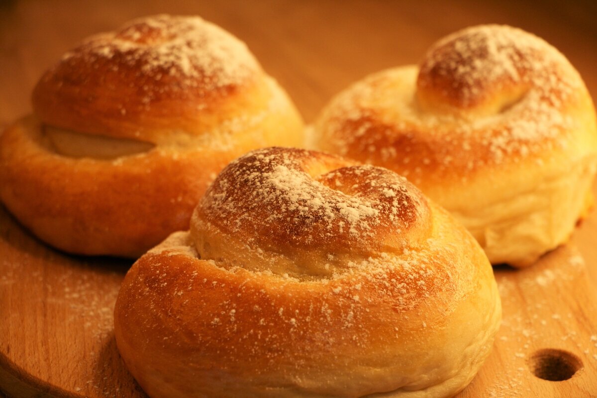 Aby bułeczki były zarumienione i błyszczące, możesz posmarować je żółtkiem (lub mieszanką żółtka z mlekiem). Na koniec wystarczy posypać cukrem pudrem i gotowe.