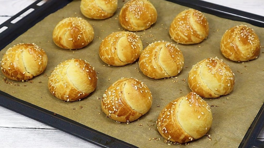 Na koniec wszystkie bułeczki ułożyć na blasze wraz z papierem do pieczenia, a ich wierzch nasmarować olejem i żółtkiem oraz posypać ziarnami sezamu.