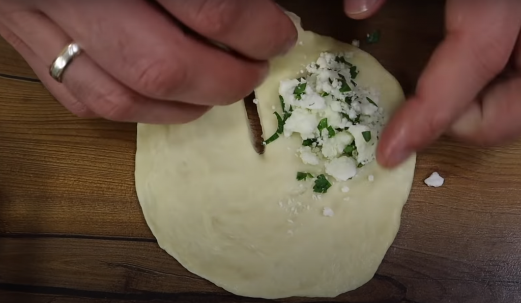 W następnym kroku każdą kulę rozpłaszczyć tak, aby przyjęła kształt okręgu, wykonać jedno nacięcie do połowy, wyłożyć farsz i zawijać ciasto w stronę wykonanego uprzednio nacięcia.