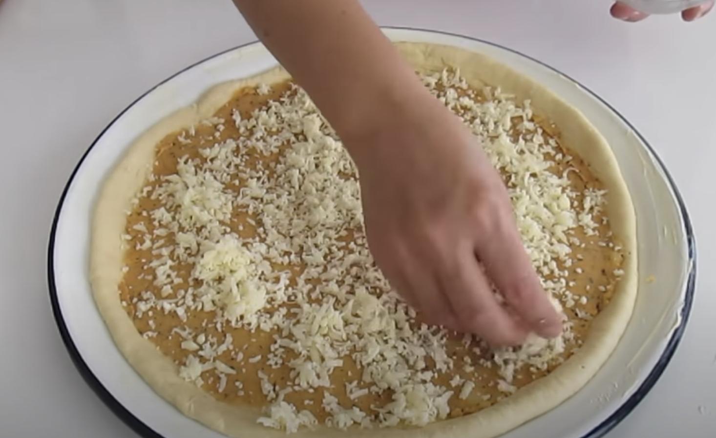 Rozwałkuj pierwszy arkusz i umieść go na wysmarowanej masłem misce. Ułóż farsz na talerzu ciasta, posyp serem i przykryj drugim arkuszem ciasta.