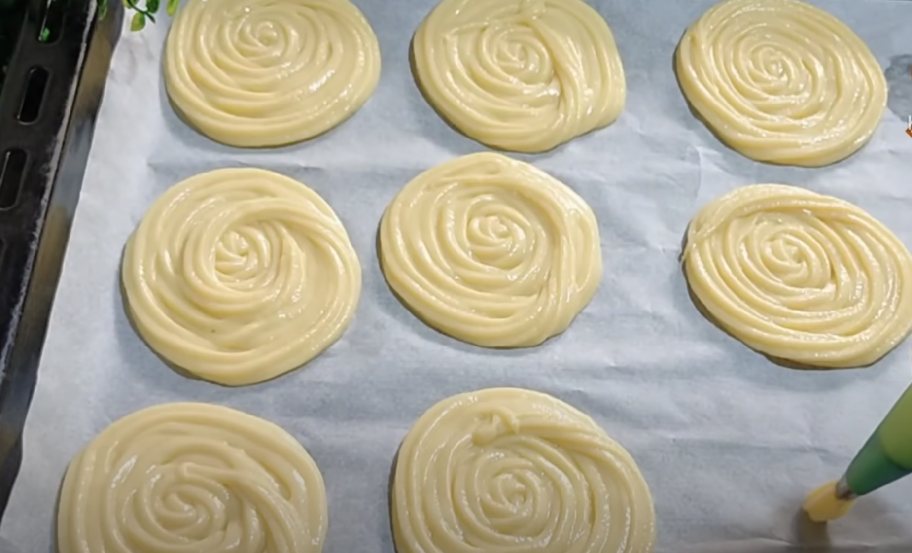 Do mieszanki dodajemy również przesiane składniki luzem. Mieszamy jedno ciasto. Ciasto układamy w torbie cukierniczej. Dozować na blasze wyłożonej papierem do pieczenia.