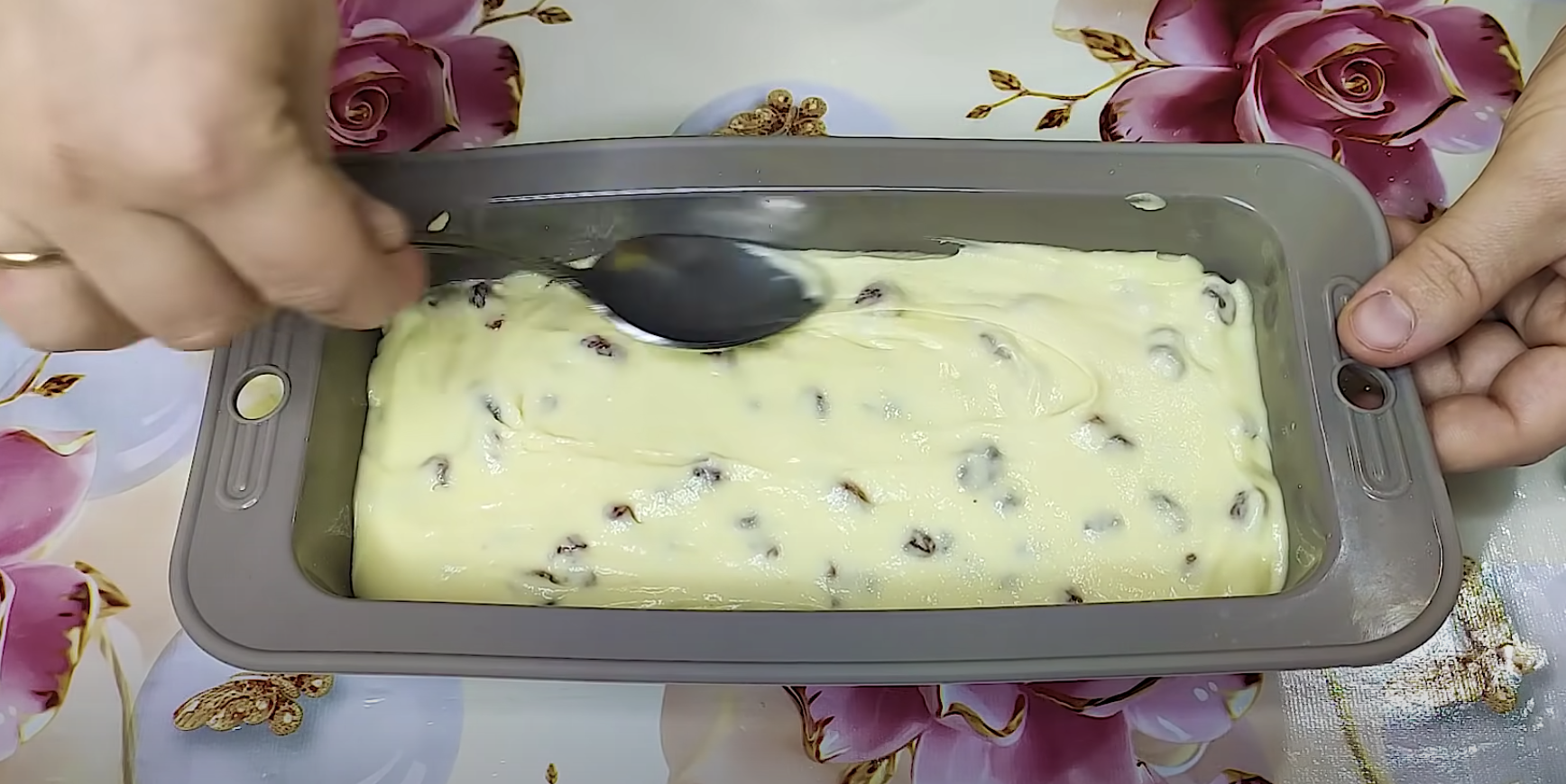 Jeśli chcesz, wsyp rodzynki lub inne dodatki, zamieszaj. Ciasto wylej na formę o wymiarach 10×22 cm i włóż do piekarnika nagrzanego do temperatury 170 stopni. Piecz 30-35 minut.