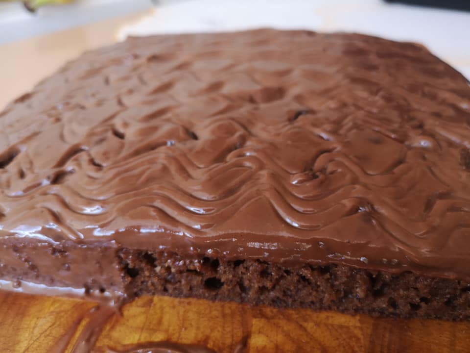 Zaparz esencjonalną filiżankę kawy rozpuszczalnej. Odstaw do przestygnięcia. Wszystkie składniki na ciasto umieść w misce i połącz ręcznie za pomocą trzepaczki. Blaszkę wysmaruj tłuszczem i obsyp mąką. Przełóż na nią ciasto. Piekarnik nagrzej do temperatury 180 °C i wstaw do niego ciasto na 45 minut. Wyjmij i poczekaj, aż ostygnie.