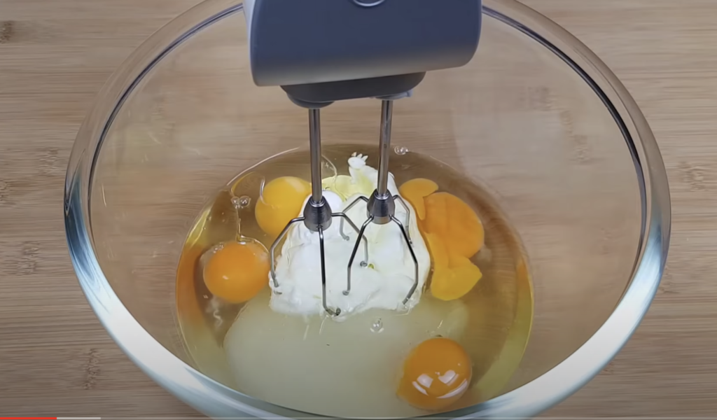 W drugiej misce umieść jajka, śmietanę, olej i cukier i ubij na puszystą masę.
