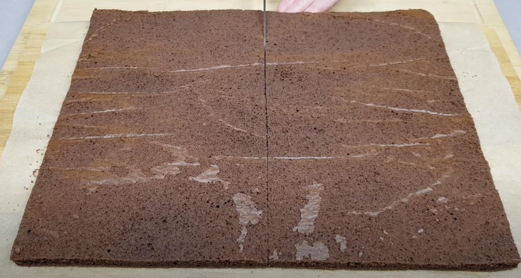 Piekarnik nagrzej do temperatury 200°C. Ciasto piecz w nagrzanym piekarniku przez 12-15 minut. Upieczone ciasto wyjmij z piekarnika i pozostaw do ostygnięcia. Odwróć je i delikatnie zdejmij papier do pieczenia. Boki ciasta wyrównaj przy użyciu ostrego noża i podziel je na cztery, takie same części.