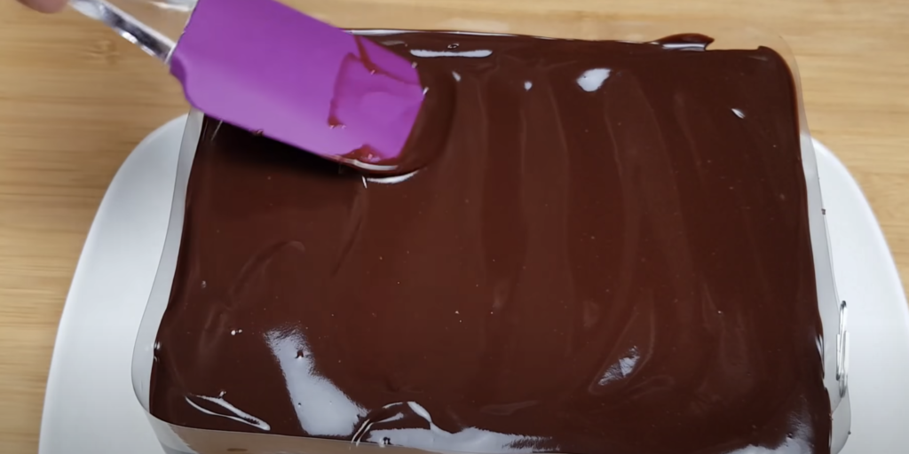 Tak przygotowane ciasto umieść w lodówce. Z podanych składników przygotuj czekoladową polewę. W garnku rozpuść masło z dodatkiem mleka. Dodaj czekoladę połamaną na kostki i mieszaj do całkowitego jej rozpuszczenia.