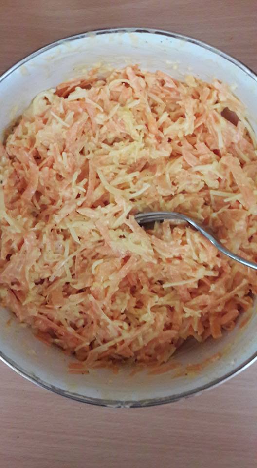 Marchew, jabłka i seler umyj i obierz. Marchew zetrzyj na drobnych oczkach, a seler i jabłko na dużych. Składniki mieszamy w misce.