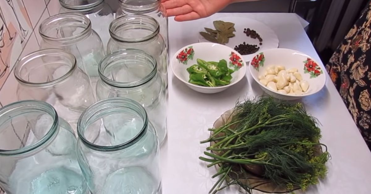 Następie, do tak przygotowanych słoików wkładamy na dno po jednej parasolce kopru, po 3-4 ząbki czosnku, w zależności od ich wielkości, jeden liść laurowy, 2-3 sztuki ziela angielskiego i około 10 ziarenek pieprzu.