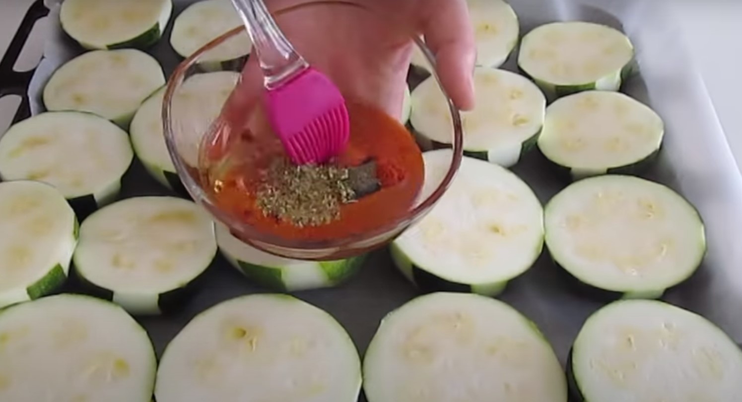 Następnie przygotuj mieszankę oleju i przypraw, a następnie rozprowadź ją na każdym plastrze cukinii. Piec na blasze w piekarniku w temperaturze 180°C przez 30 minut.