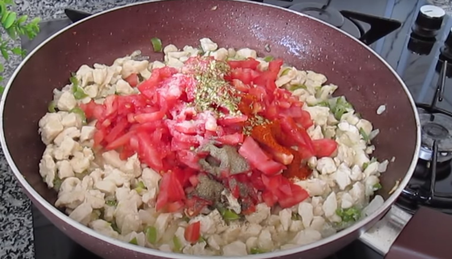 Następnie dodać na patelnię kurczaka i dalej smażyć. Od czasu do czasu mieszać. Następnie dodać pokrojone pomidory i sól. Wszystko dobrze wymieszać, a następnie wyłączyć ogień.