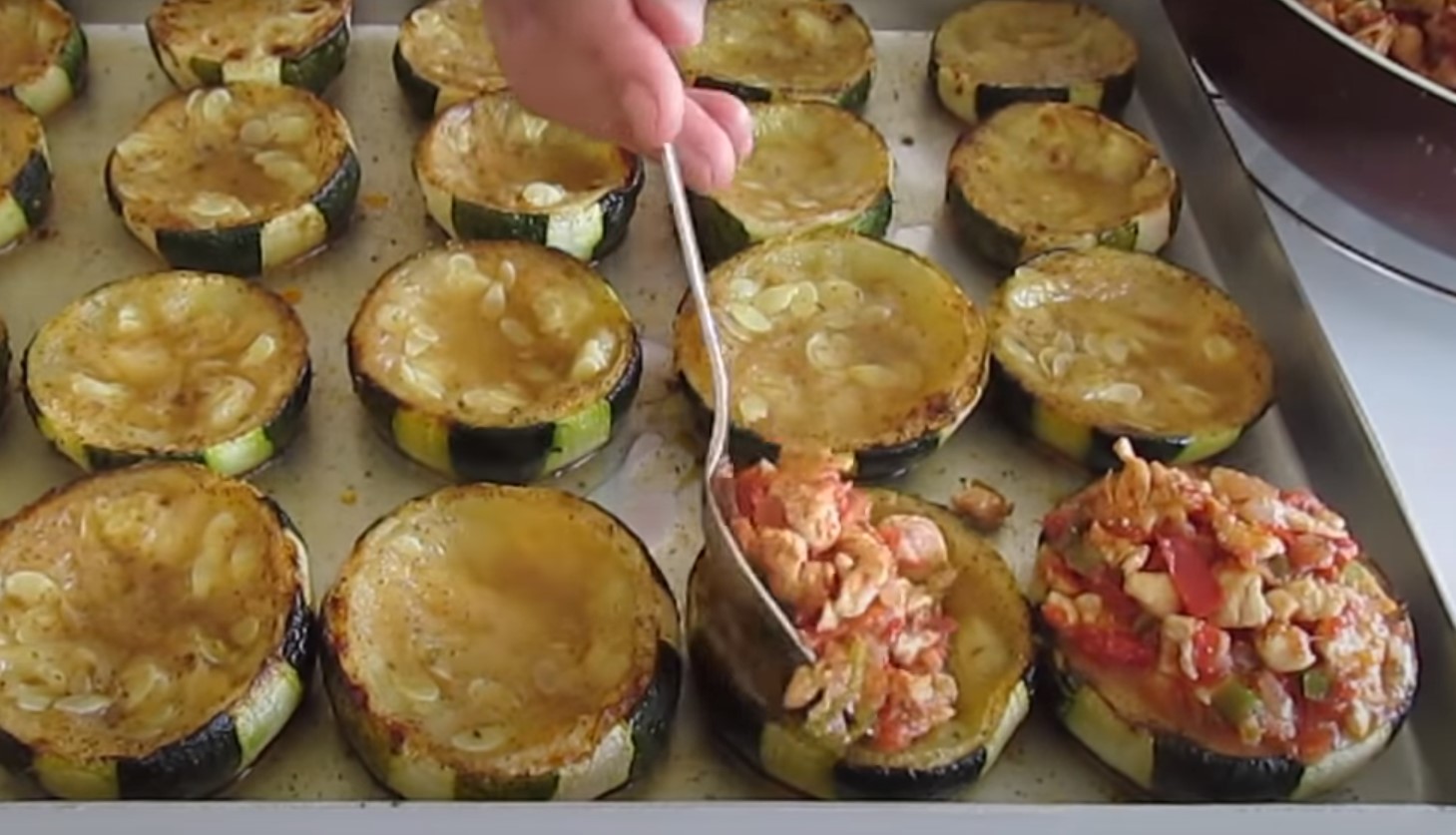Wyjąć cukinie z piekarnika. Za pomocą łyżki delikatnie zrobić małe dziurki w każdym okrągłym plasterku. W zagłębienia należy włożyć nadzienie z patelni. Na każdej faszerowanej cukinii należy położyć plasterek pomidora.