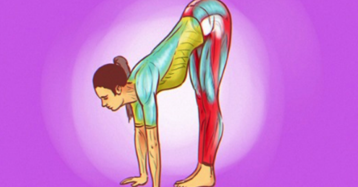 Ustaw się prosto, z nogami na szerokość barków, a potem powoli opuść ręce, zaokrąglając plecy, aż dotkniesz podłogi. Nawet jeśli na początku Ci się to nie uda, nie zniechęcaj się. To ćwiczenie efektywnie rozciąga mięśnie pleców i tylną część ud.