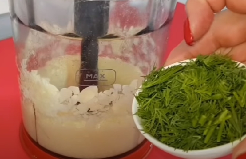 Tak jak w powyższym przypadku, obierz czosnek i posiekaj go za pomocą blendera. Weź świeży koperek, drobno go posiekaj i dodaj do przygotowanego czosnku.