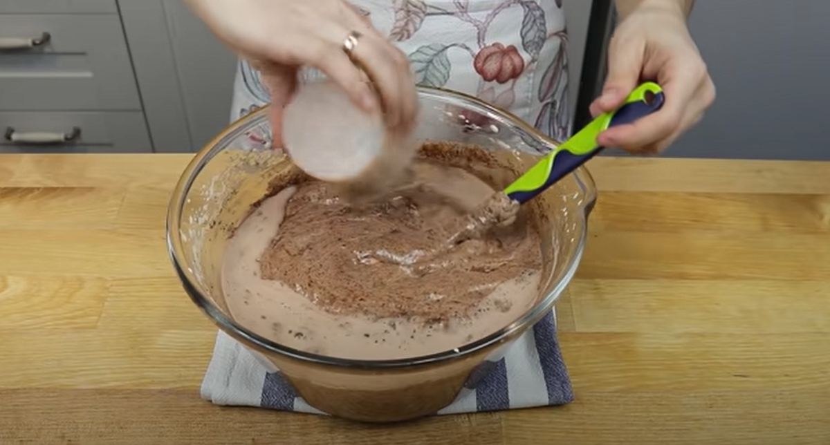 W osobnej misce połącz mąkę z proszkiem do pieczenia i kakao, przesiej wszystko przez sito i stopniowo dodawaj do miski z masą. Delikatnie wymieszaj całość.