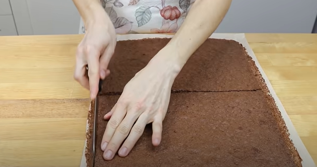 Wykałaczką sprawdzaj czy ciasto jest już gotowe, jeśli tak, wyjmij je i daj mu w pełni wystygnąć. W dalszej kolejności przetnij biszkopt na pół i, jeśli okaże się to konieczne, krawędzie ciasta przytnij nożem w taki sposób, aby były one proste.