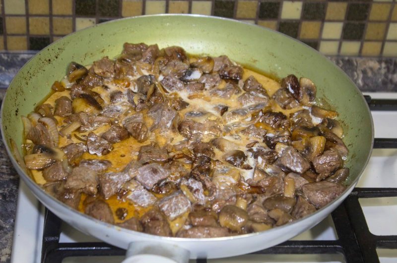 Kolejny krok to pokrojenie mięsa w małą kostkę i dodanie go do smażących się cebuli i pieczarek. Wszystko smażymy przez 10 minut. Następnie wrzucamy musztardę, koncentrat pomidorowy i tymianek, po czym zalewamy wodą i mieszamy. Całość dusimy pod przykryciem przez około 30 minut na średnim ogniu.