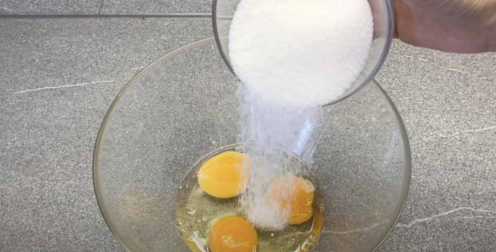 Wbić jajka do miski. Dodać cukier, cukier wanilinowy i zmieszać.
