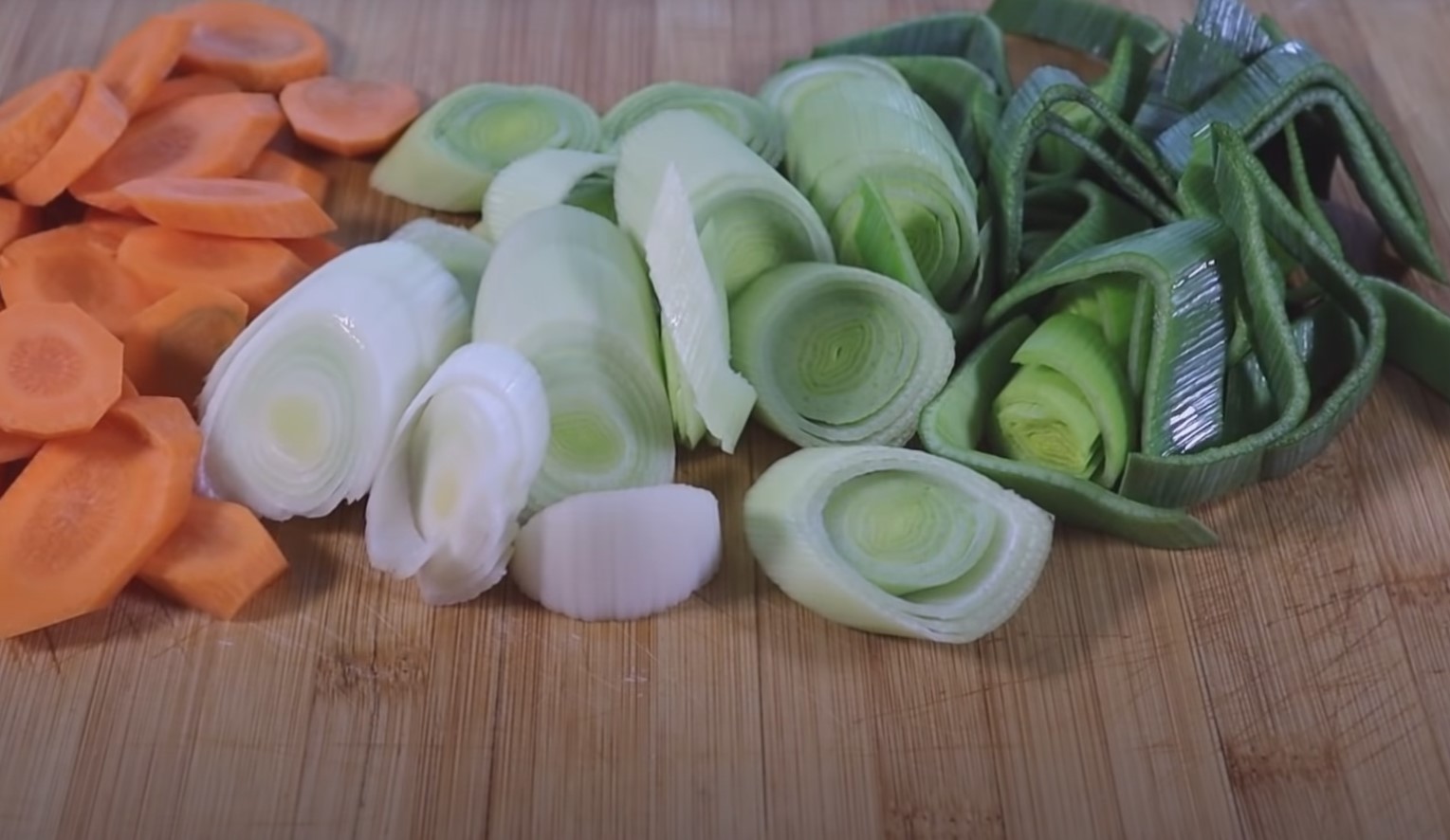 Marchewkę obieramy i kroimy ukośnie na plasterki.