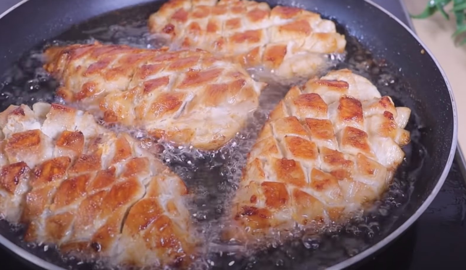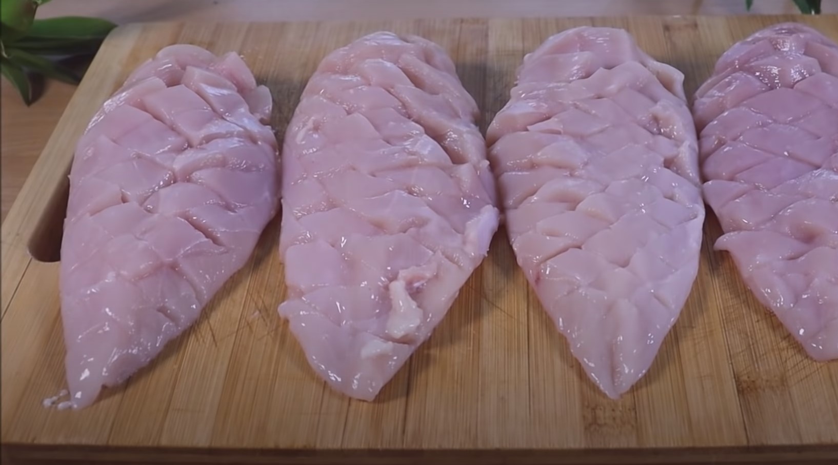 Pojedyncze piersi z kurczaka kroimy ostrym nożem tworząc kratkę. Nie kroimy zbyt głęboko, aby nie przekroić do końca mięsa.