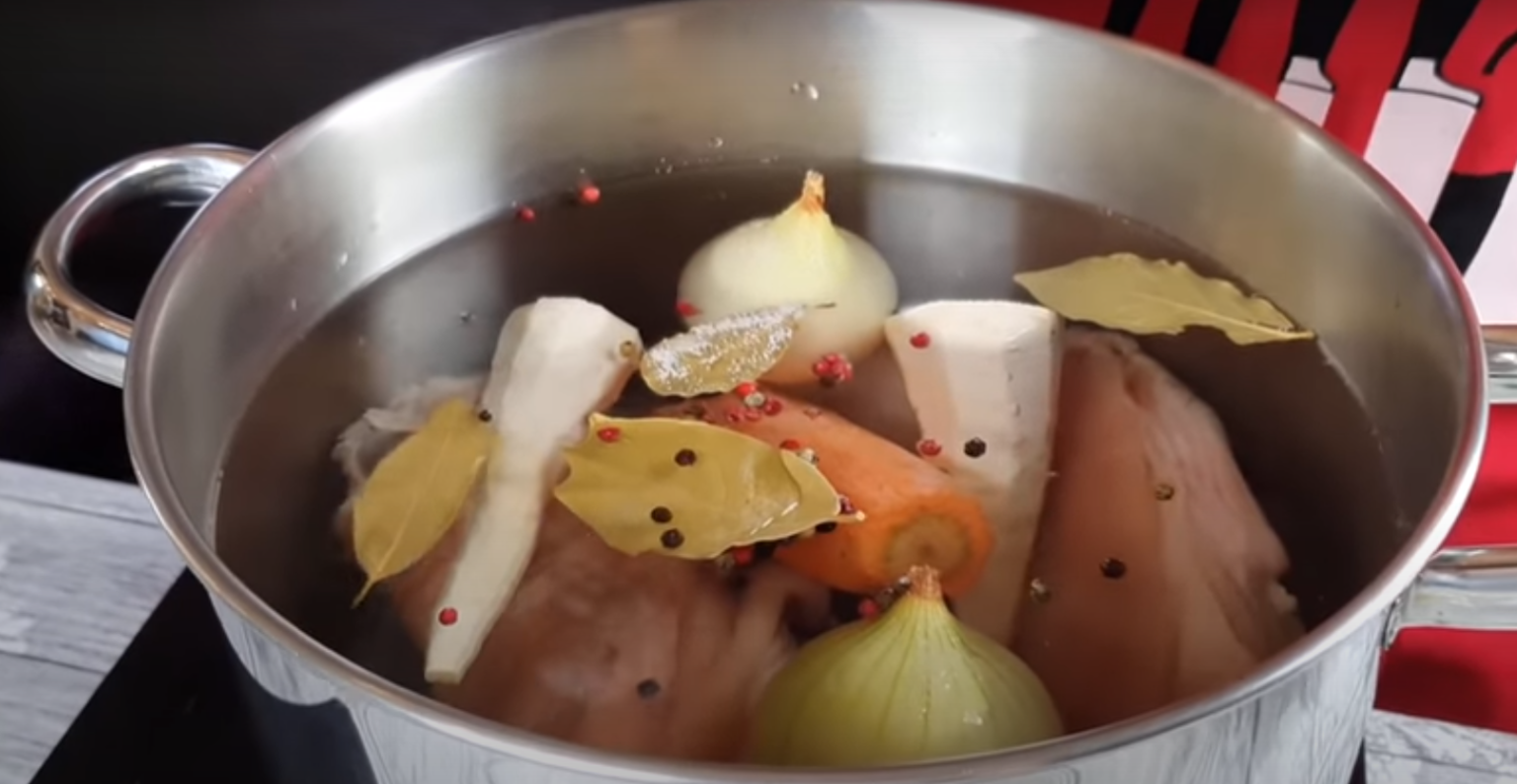 Włóż golonki do garnka z wodą, a następnie zagotuj. Gdy pojawi się piana, usuń ją i zastąp świeżą wodą. Włóż do niej warzywa i gotuj wraz z mięsem i przyprawami.