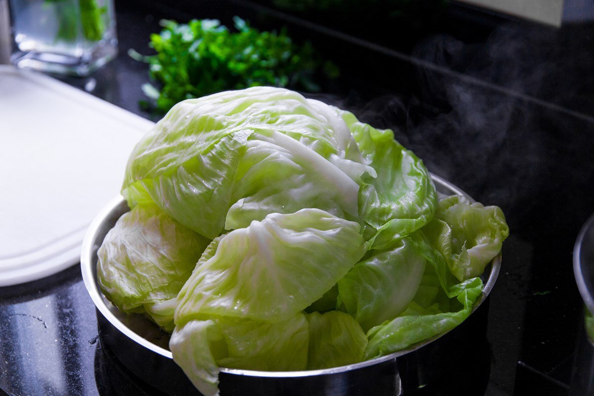 W głębokim garnku zagotowujemy wodę (tyle, żeby przykryła kapustę). Główkę kapusty myjemy, usuwamy wierzchnie liście a następnie wycinamy głąb. Kiedy jest gotowa, wkładamy ją do wrzącej wody. Liście wyjmujemy pojedynczo, kiedy stają się miękkie. Odkładamy na bok do wystudzenia.