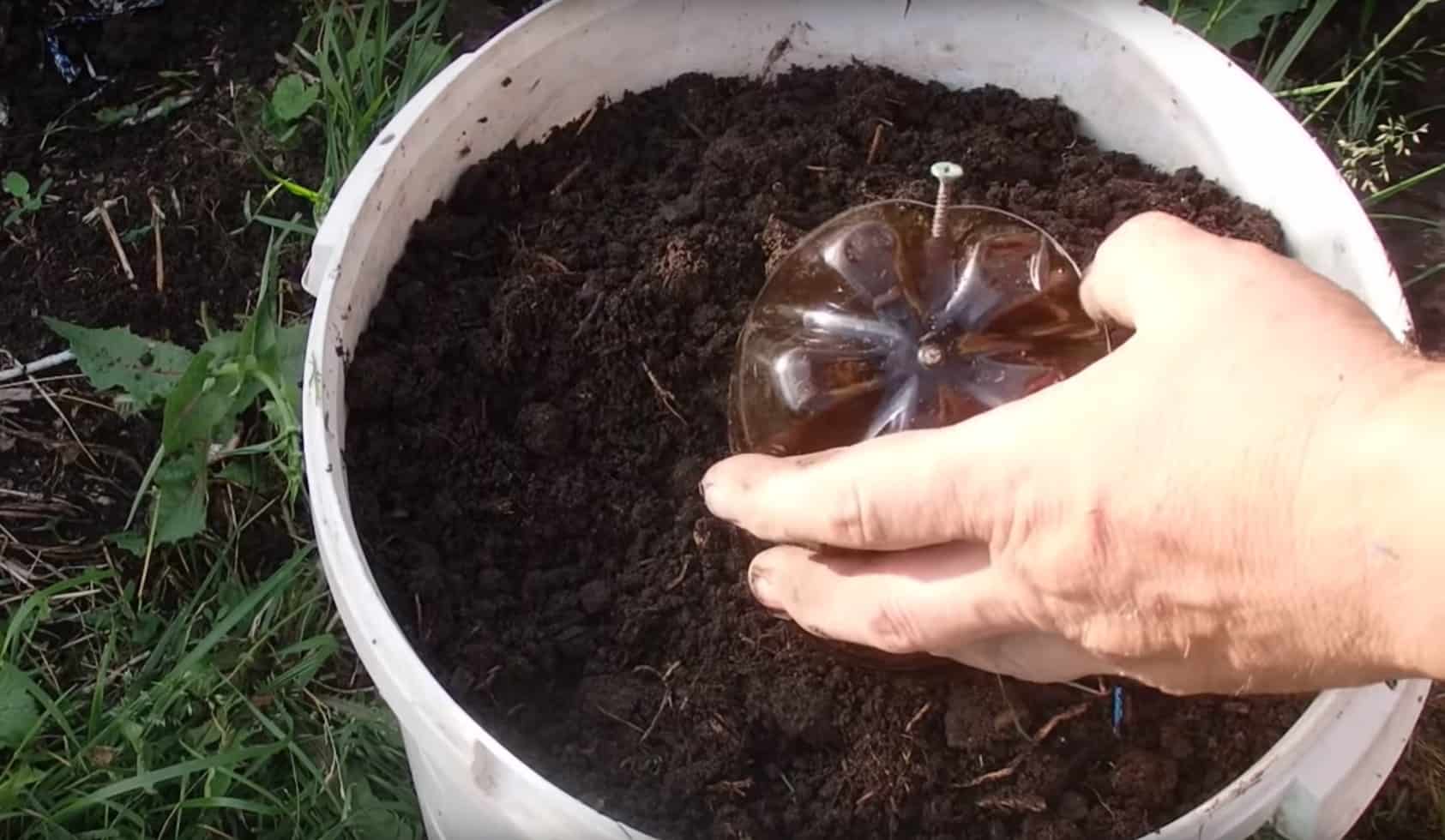 Napełnijcie butelkę wodą, wciśnijcie od strony szyjki w ziemię i do dna butelki przykręćcie śrubkę, która wyrobi nam małą dziurkę.