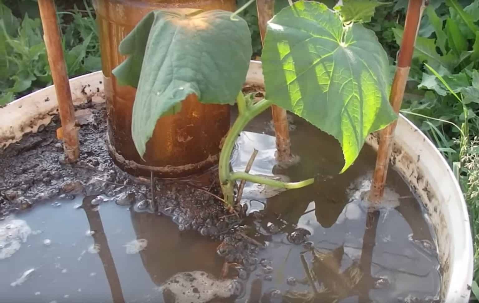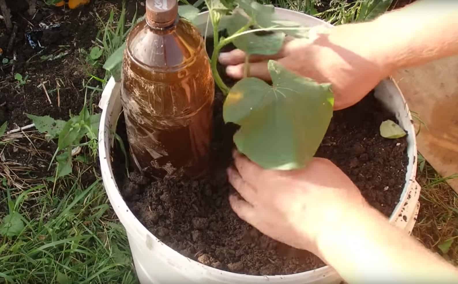 Po tym zostaje nam już tylko obwiązać ogórka do patyków-wsporników i po wchłonięciu całej wody, uzupełnienie ziemi do krawędzi wiadra.