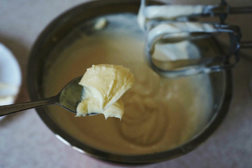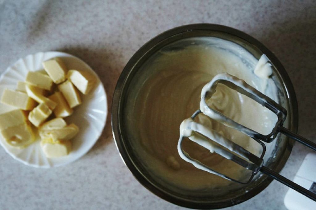 Nadszedł czas na masło – ubij je za pomocą trzepaczki i połącz ze schłodzoną śmietaną.