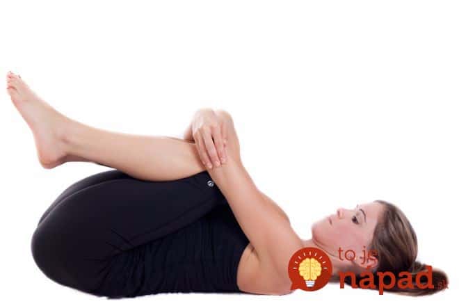 Leżąc na plecach, relaksuj się. Przytul kolana do ciała, trzymając stopy rękoma. Zostań w tej pozycji przez pełną minutę.