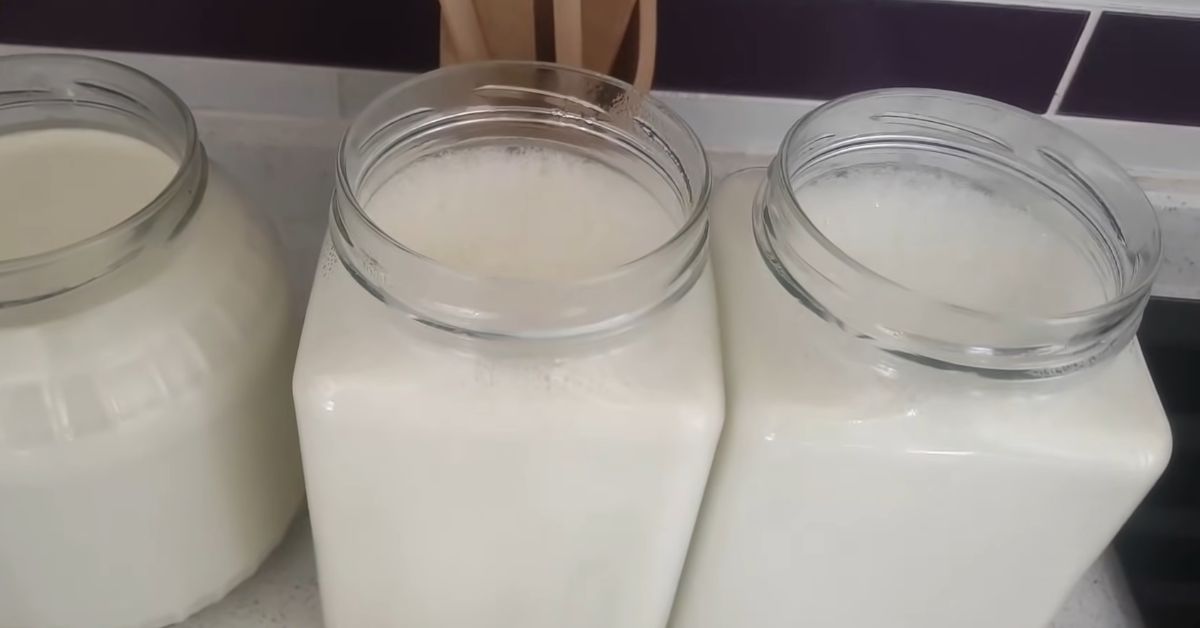 Powinno tak stać do osiągnięcia 45 stopni Celsjusza. Sprawdzaj temperaturę co jakiś czas przy użyciu termometru kuchennego. Z każdego słoika wyjmij 1 łyżkę mleka i wlej do osobnej miseczki. Dodaj drożdże i starannie wymieszaj. Jak się już roztopią przelej otrzymaną konsystencję do słoików.