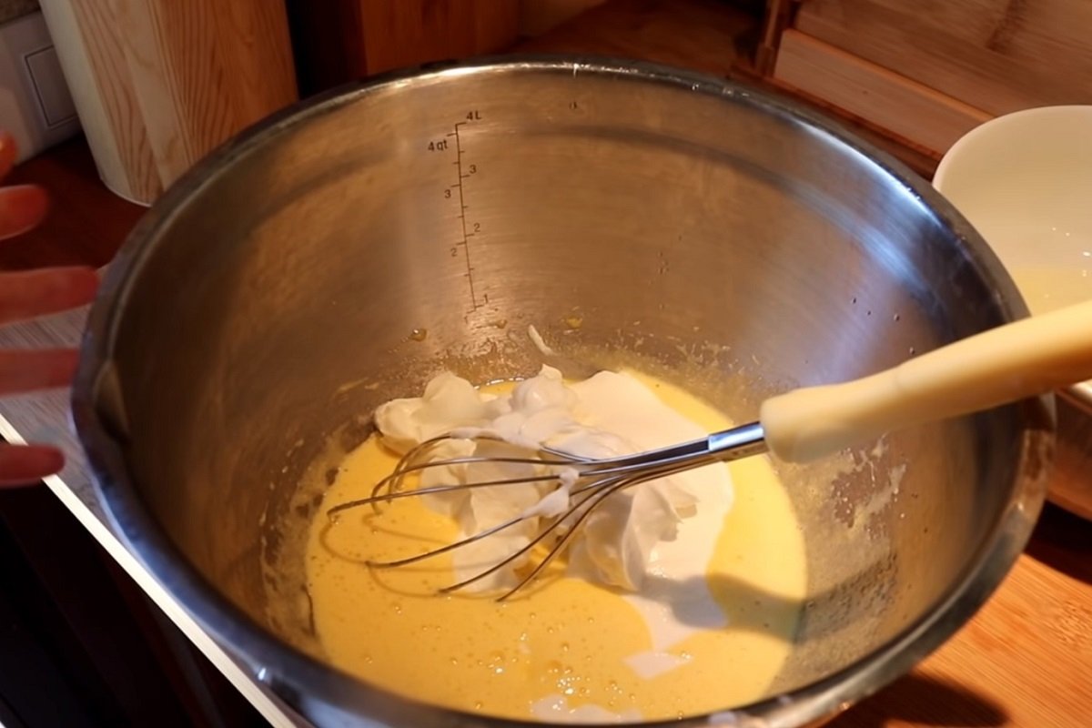 Białka ubić w osobnym naczyniu (można dodać kilka kropel soku z cytryny) na sztywną pianę. Ubita pianę dodać do masy jogurtowej i wszystko razem delikatnie wymieszać do uzyskania jednolitej konsystencji.