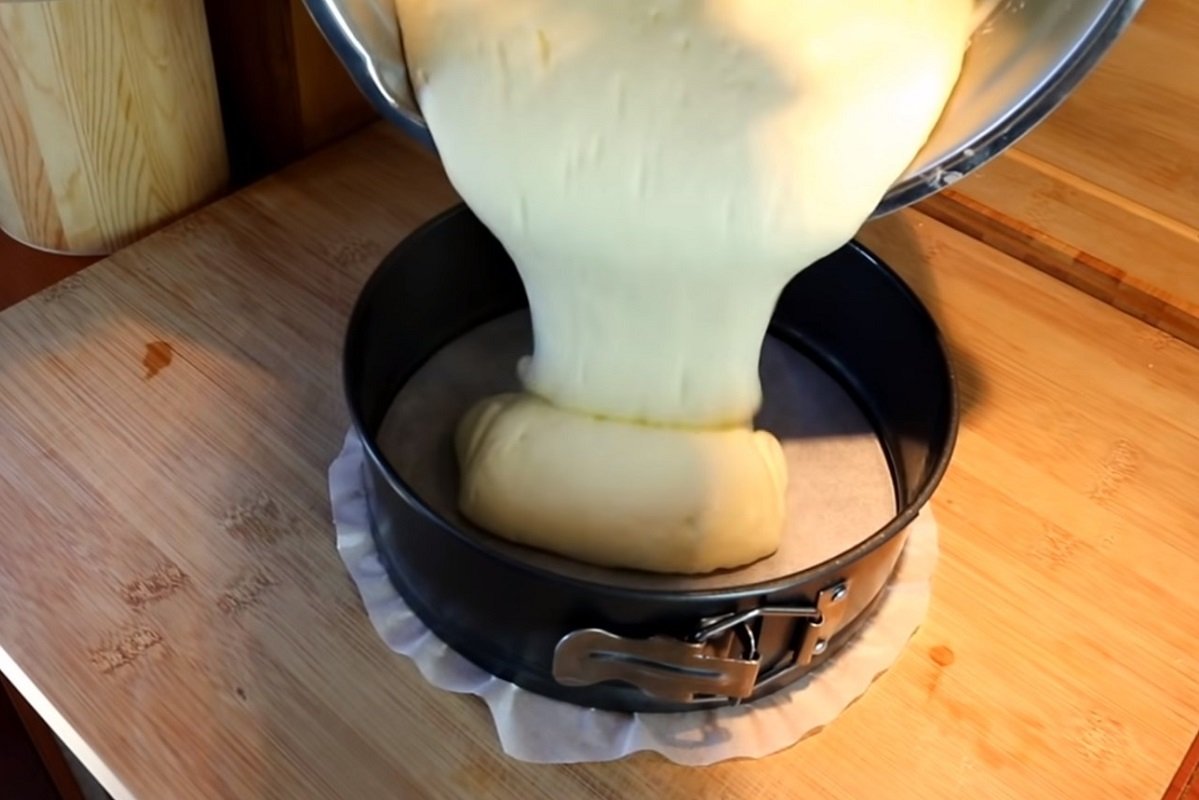 Gotową masę można przełożyć do blaszki wyłożonej papierem do pieczenia (do upieczenia ciasta potrzebna jest naczynie o średnicy 20 cm). Ciasto piec przez 45 minut w piekarniku rozgrzanym do 170 stopni.