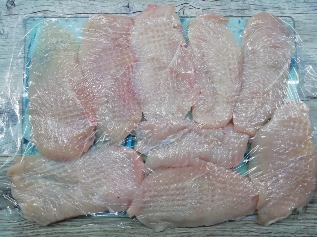 Pokrój mięso na 8 plastrów. Steki kładziemy na twardej powierzchni. Przykryj folią i postukaj tłuczkiem.