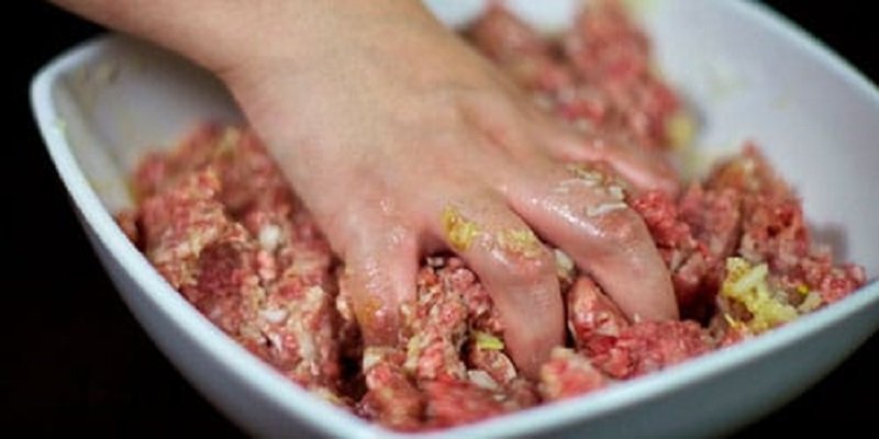 W misce wymieszaj ze sobą mięso mielone wołowe oraz jagnięce, następnie dodaj mieszankę sody i cytryny, dokładnie połącz. Wyrabiaj mięso dłońmi przez co najmniej kilka minut, Az stanie się lepkie.