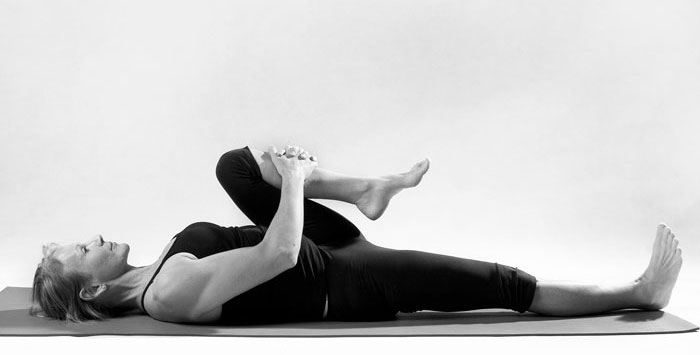 Połóż się wygodnie na plecach na macie do ćwiczeń. Nogi pozostaw wyprostowane. Powoli jedna z nóg ugnij w kolanie, obejmij łydkę obiema dłońmi i przyciągnij całą nogę do klatki piersiowe.