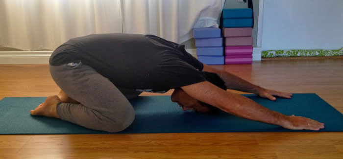 Na macie uklęknij, pośladki oprzyj na stopach. Wyprostowane ręce wyciągnij przed siebie i oprzyj je na macie.