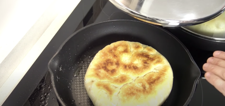 Gotowe kule należy odstawić do wyrośnięcia na około trzydzieści minut. Gdy odstawimy ciasto na chleb do wyrośnięcia w między czasie należy nasmarować głęboką patelnię olejem, a po wyrośnięciu ciasta jedną z kul trzeba delikatnie przełożyć na patelni i smażyć pod przykryciem na średnim płomieniu/bądź na połowie mocy przez około 12-15 minut.